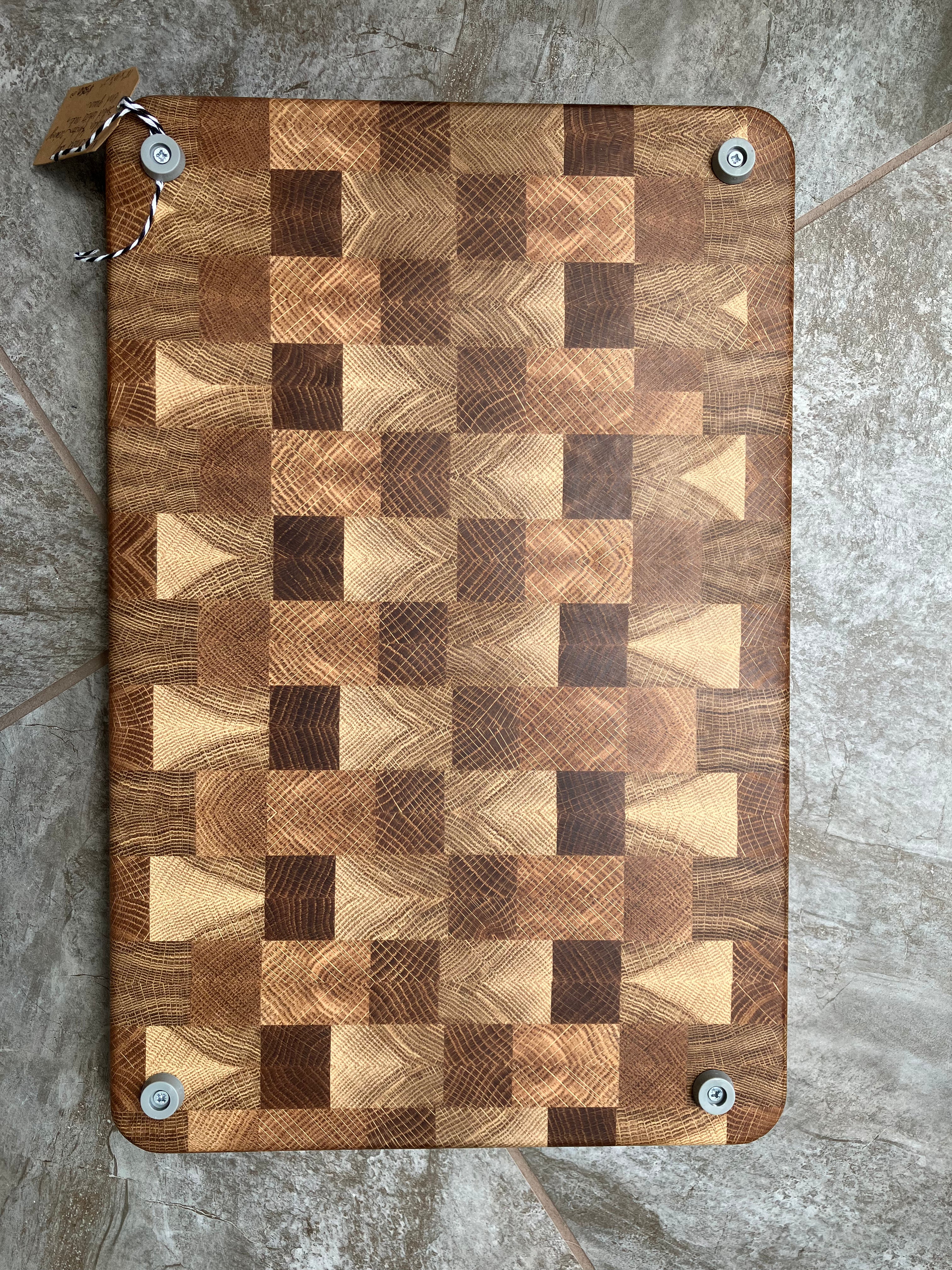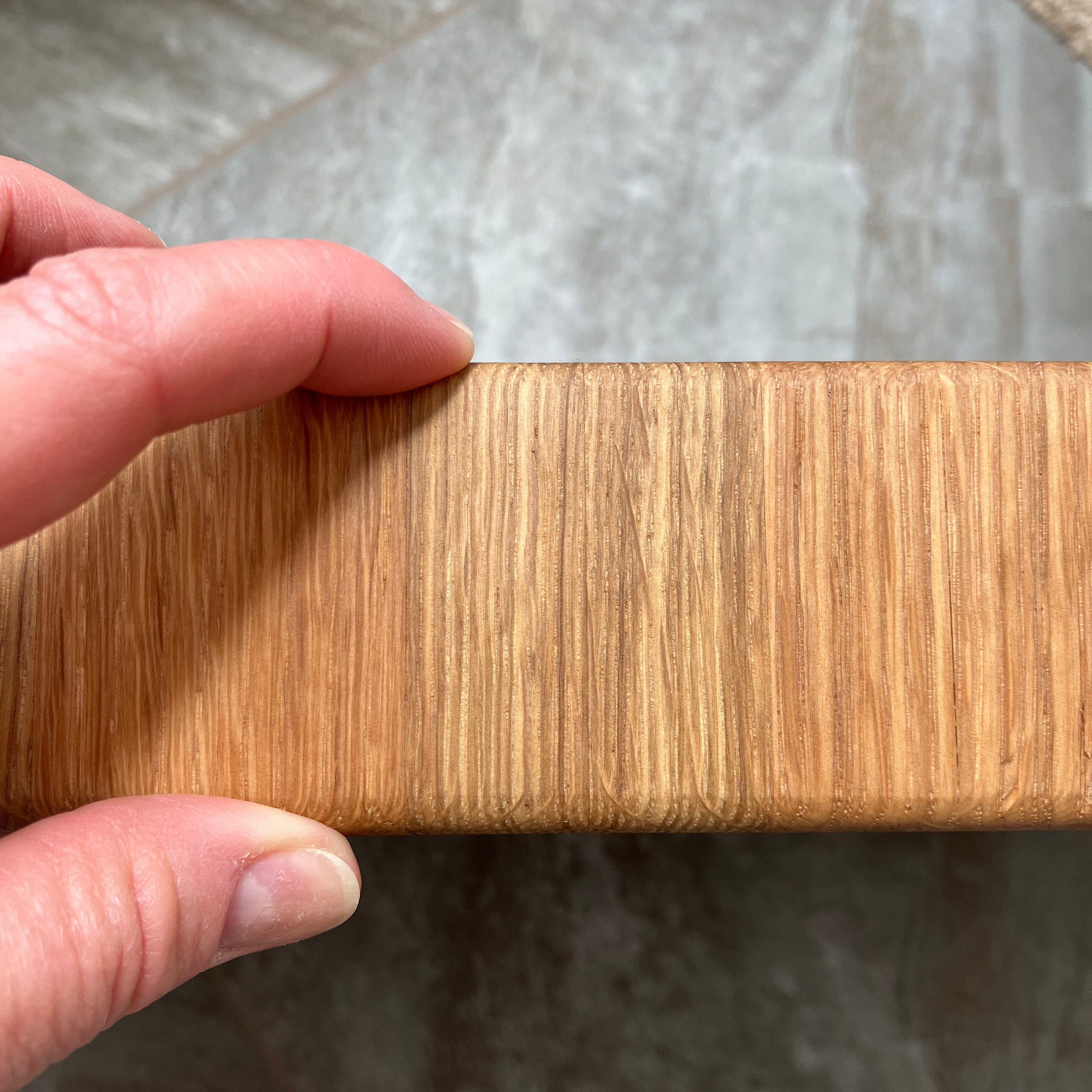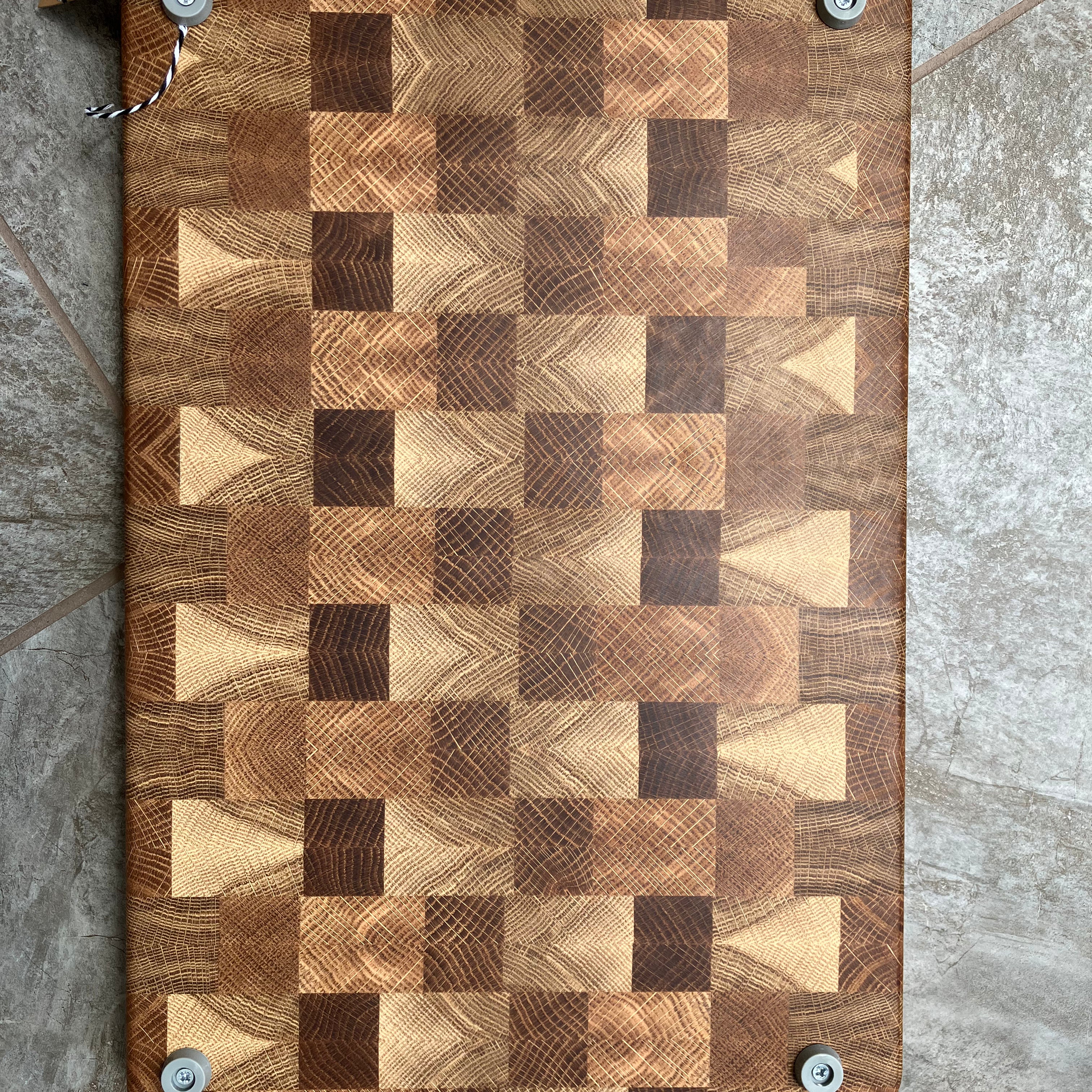This end grain solid oak wooden cutting board is a handmade, one of a kind piece. Made from high-quality oak, it not only adds a touch of natural beauty to your kitchen, but its end grain construction also allows for better durability and knife protection. Perfect for any cooking or chopping task. This beautiful wooden board can be used as a display for charcuterie, and presented on the table as a serving piece.