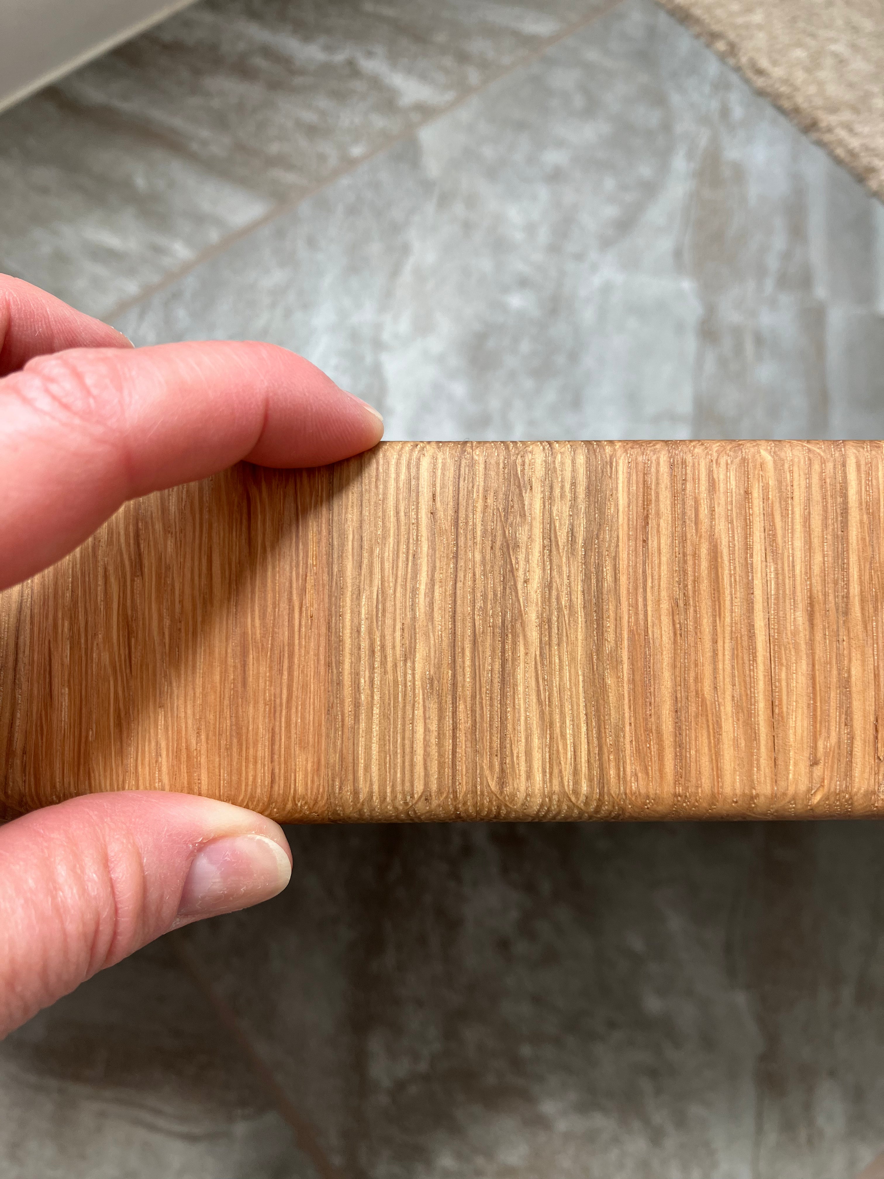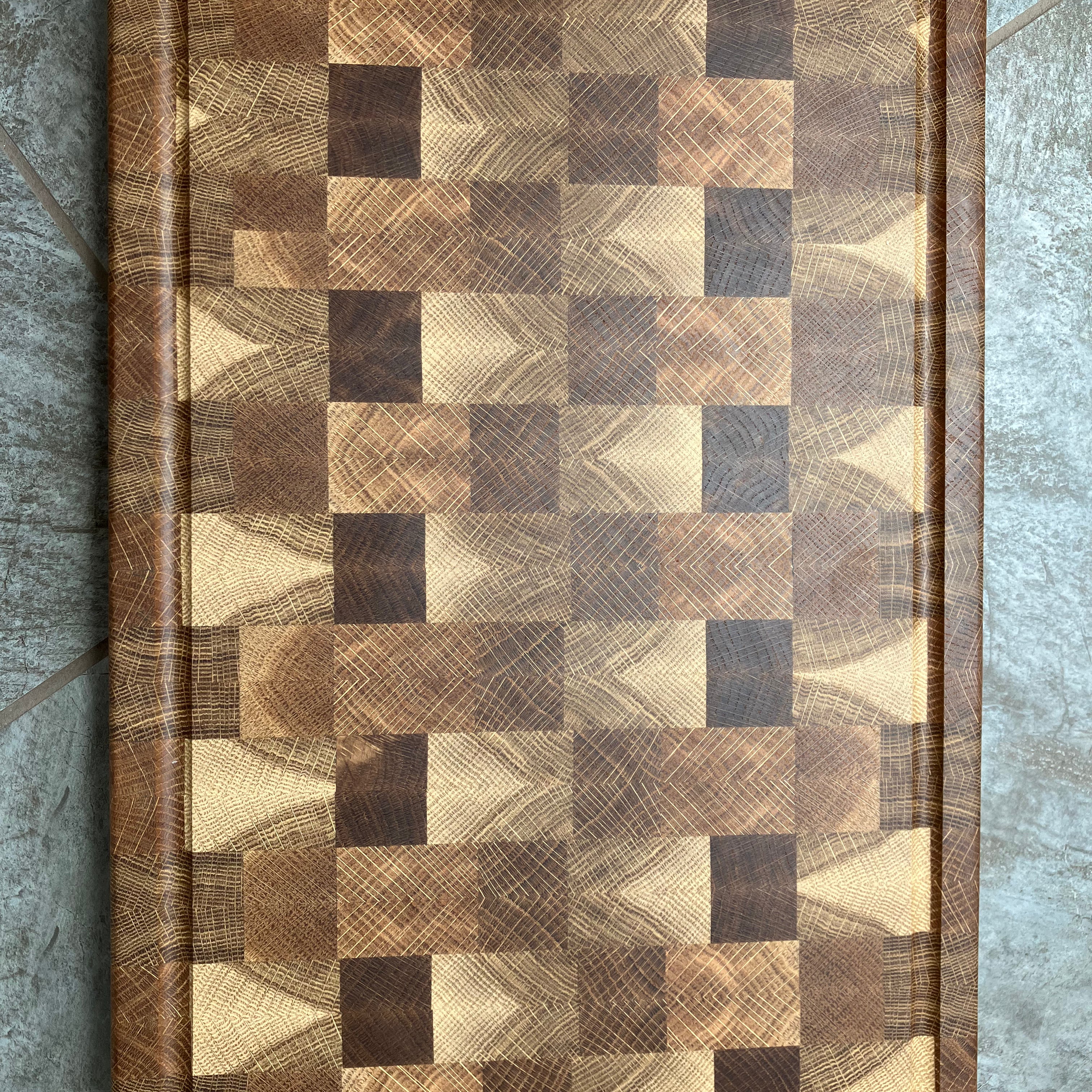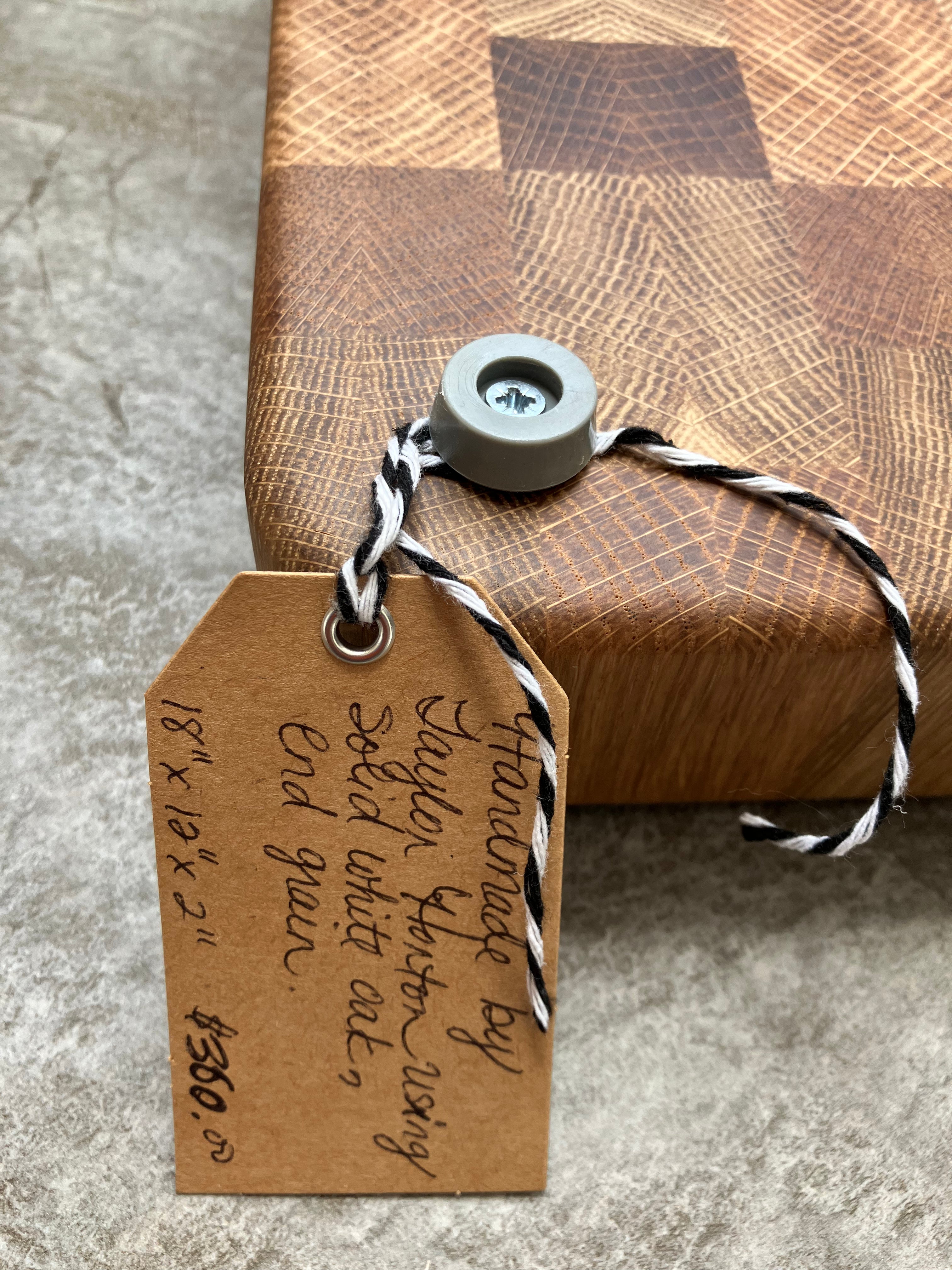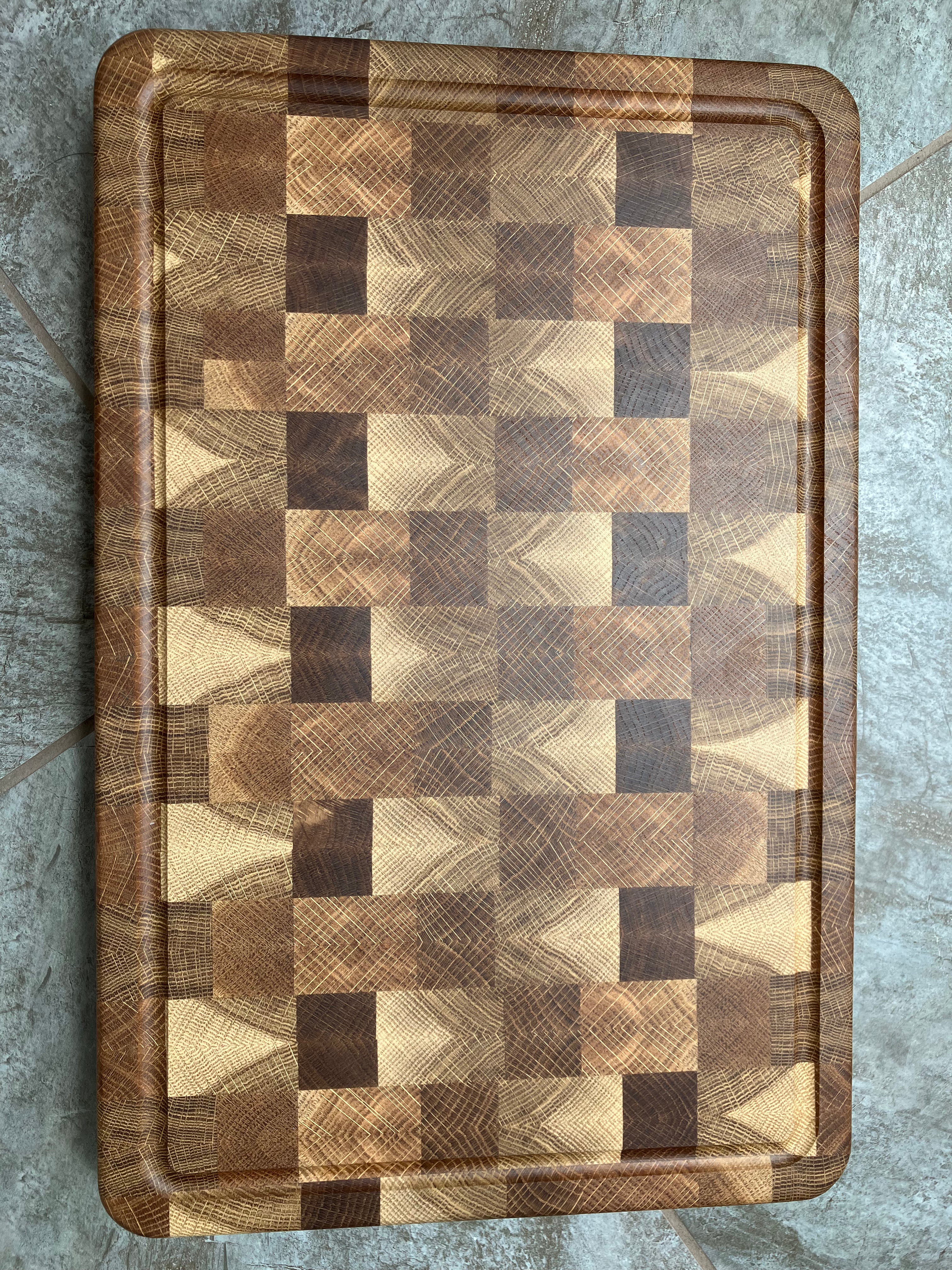 This end grain solid oak wooden cutting board is a handmade, one of a kind piece. Made from high-quality oak, it not only adds a touch of natural beauty to your kitchen, but its end grain construction also allows for better durability and knife protection. Perfect for any cooking or chopping task. This beautiful wooden board can be used as a display for charcuterie, and presented on the table as a serving piece.