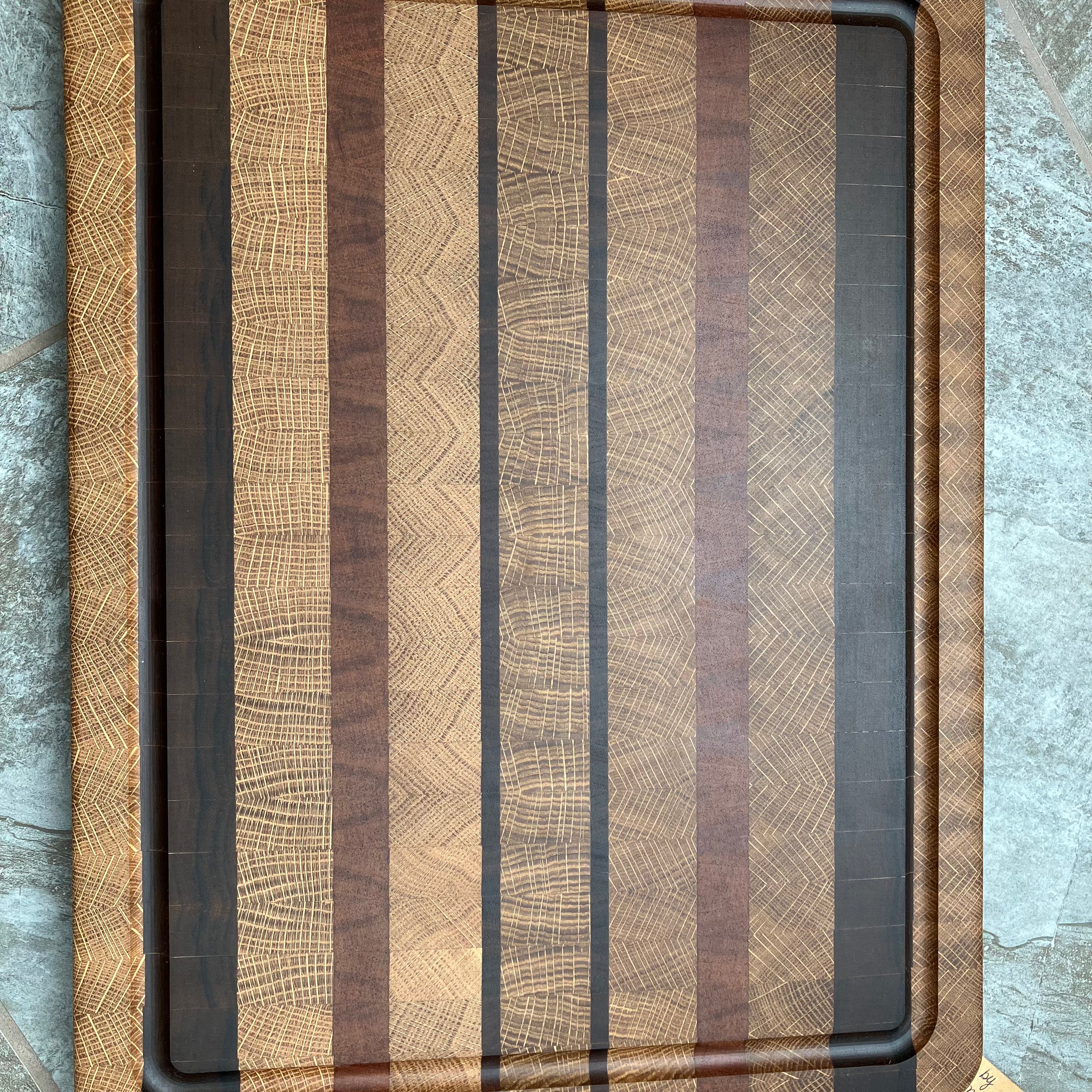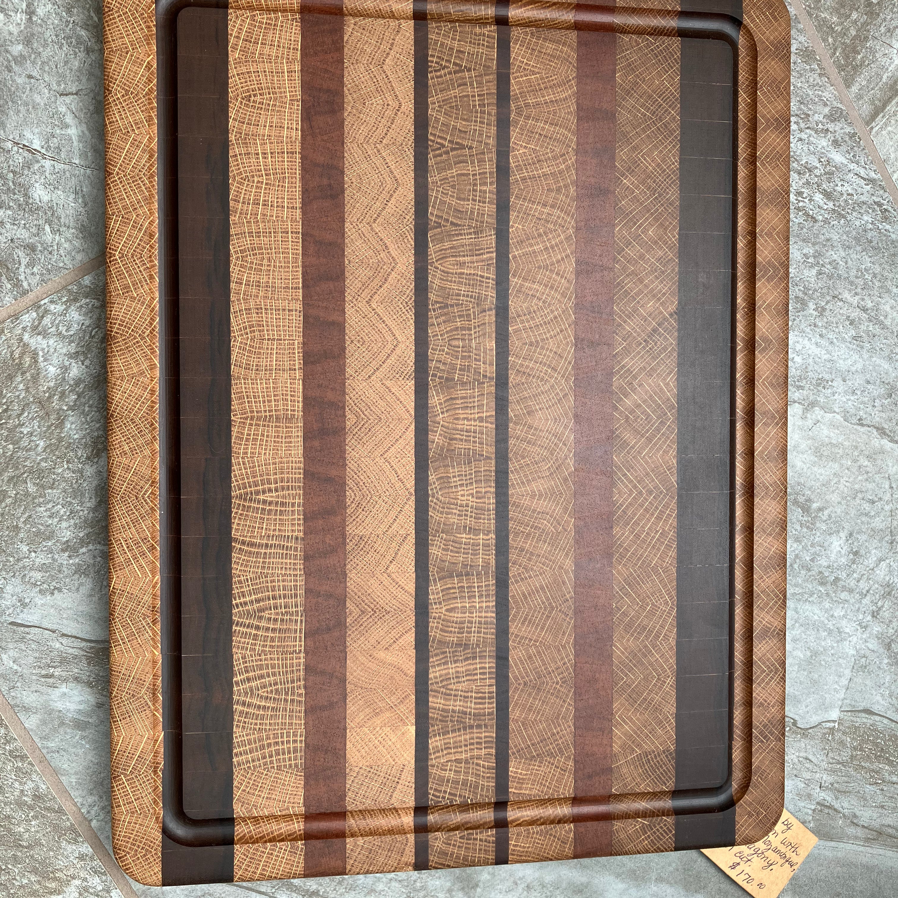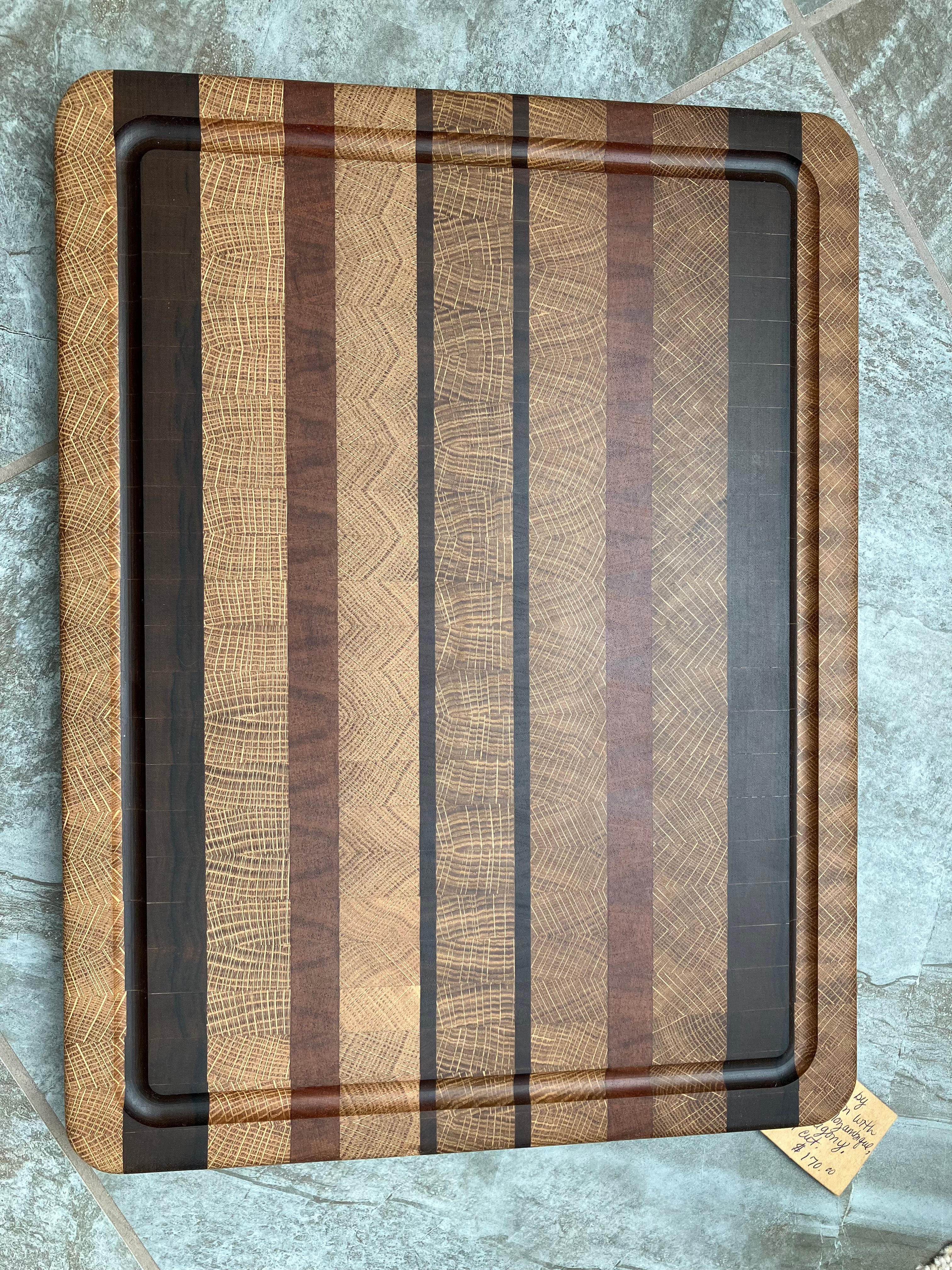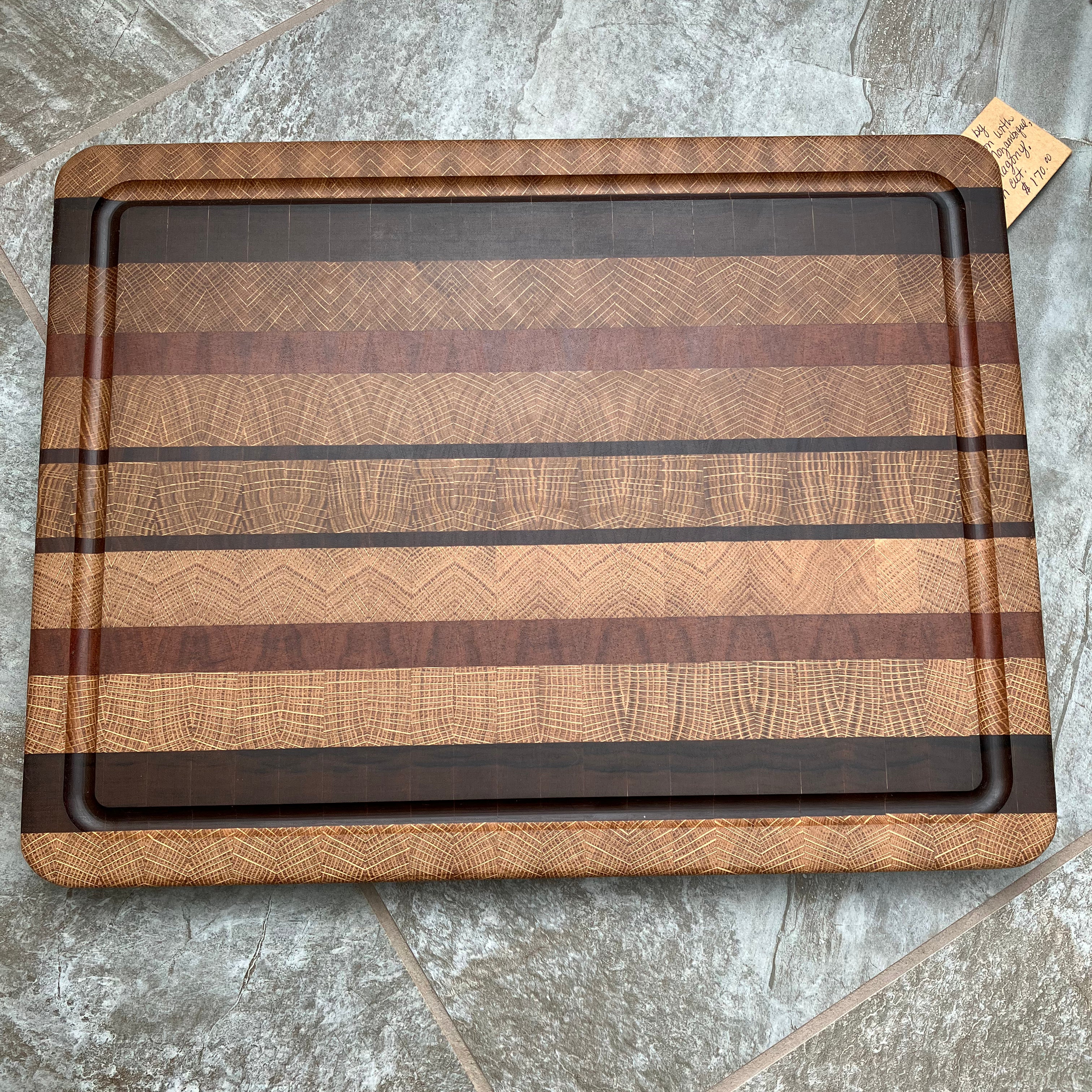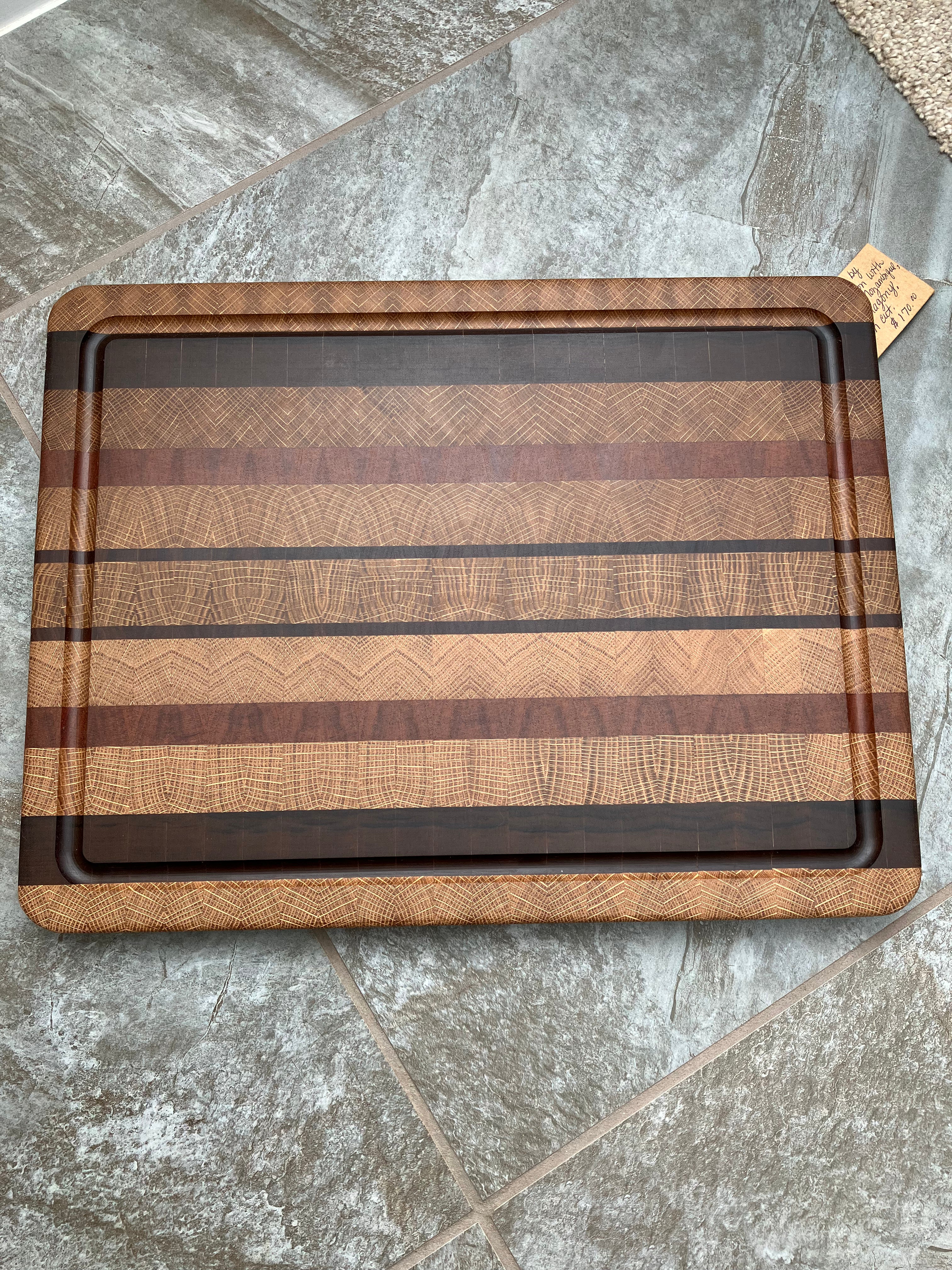 This handmade cutting board is made with white oak, Mozambique, and Khaya mohagony wood of the finest quality. A Taylor Horton Original piece. No two are alike and are heirloom pieces to last a lifetime.