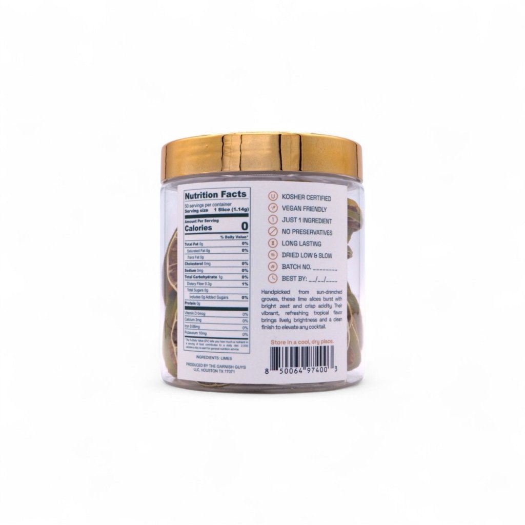 Each lime is hand-selected for peak freshness, then slowly dehydrated to preserve its vivid green color, tart aroma, and natural flavor. The result is an elegant, shelf-stable garnish that enhances presentation while infusing subtle citrus notes into every sip.