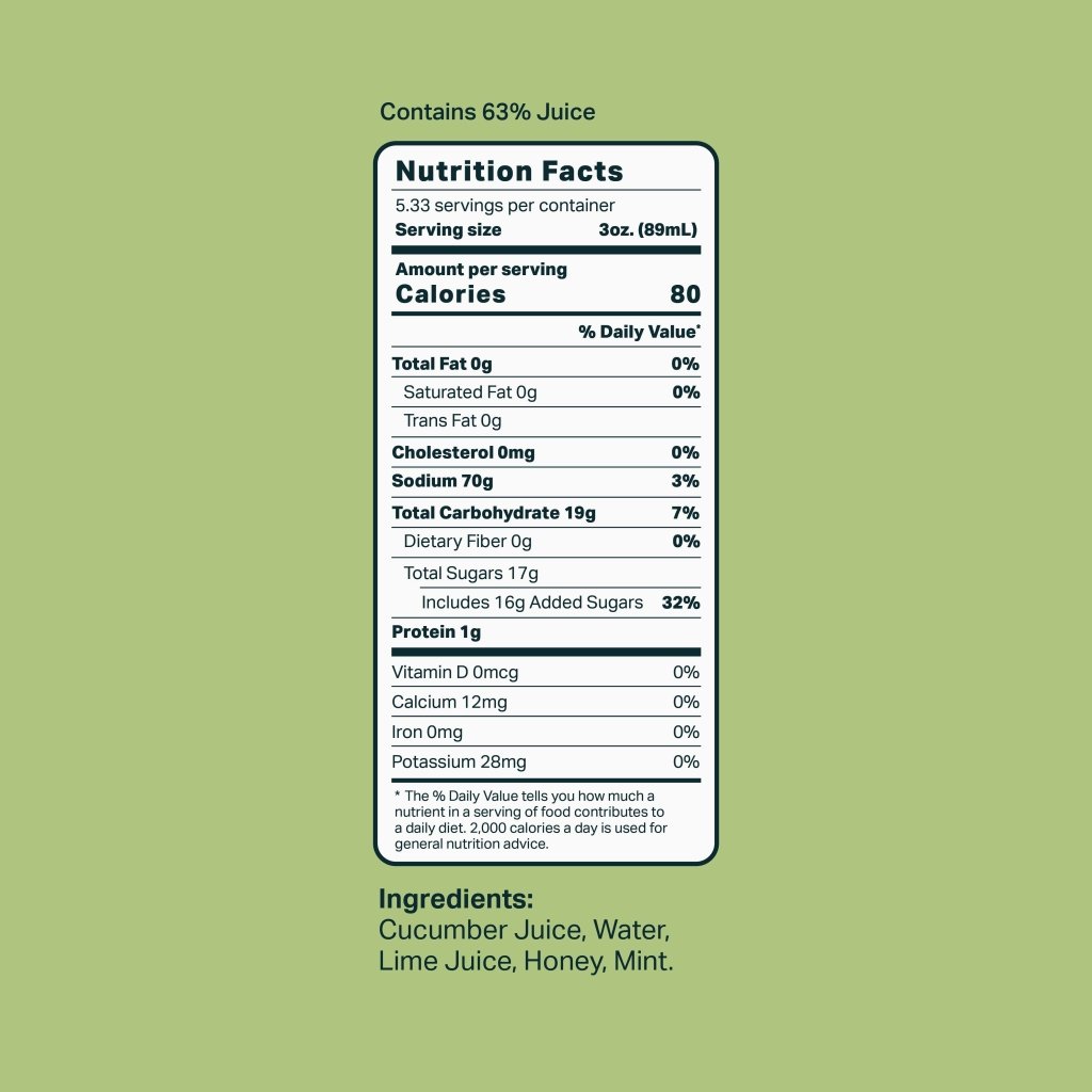 Our Cucumber Mint Lime is made simply with cucumber, water, lime, honey and mint.